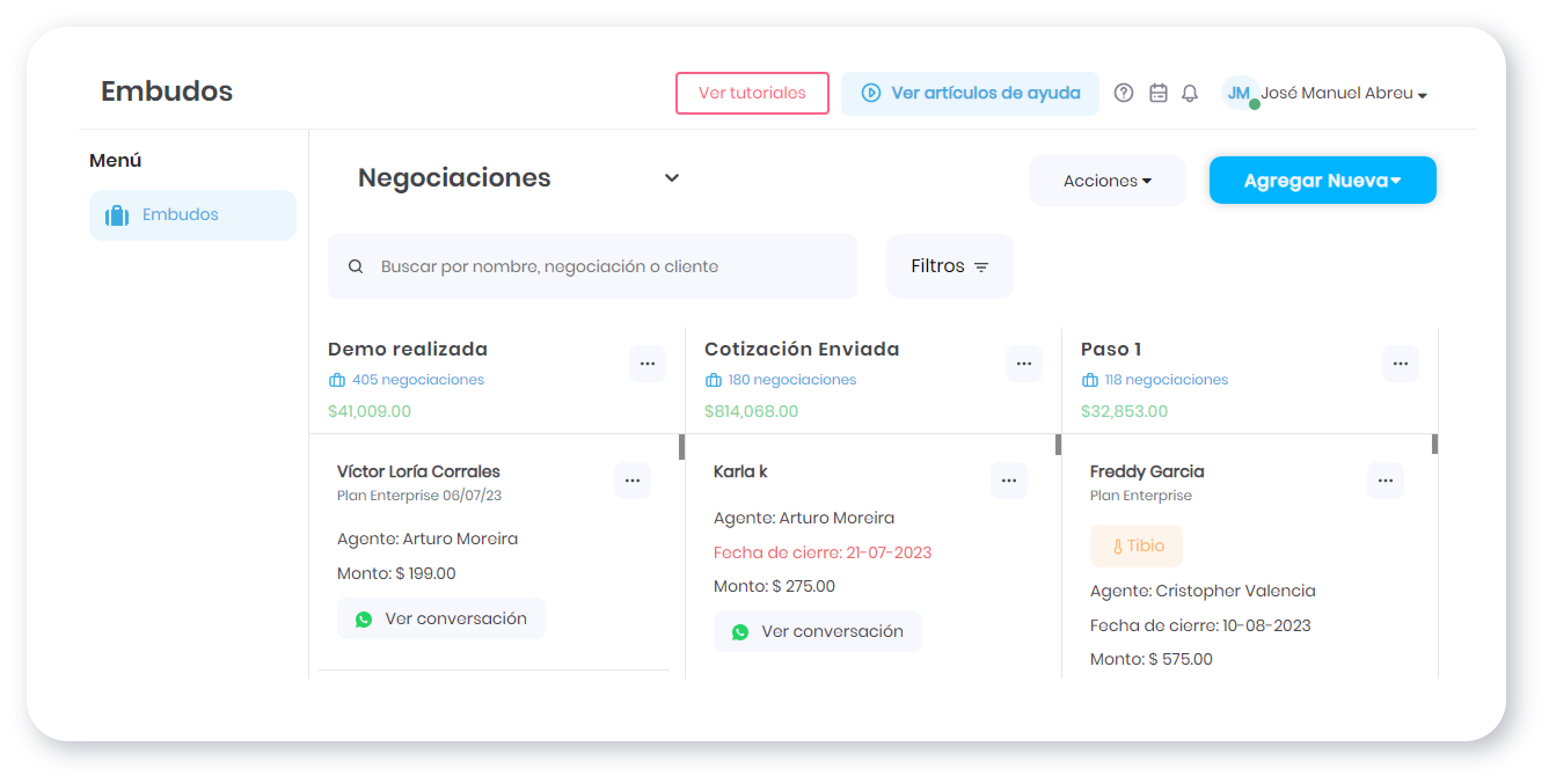 Con la nueva regla de mensajería, cada vez que un cliente te contacte se generará automáticamente una negociación, la cual podrás asignar a un embudo y etapa en específico.