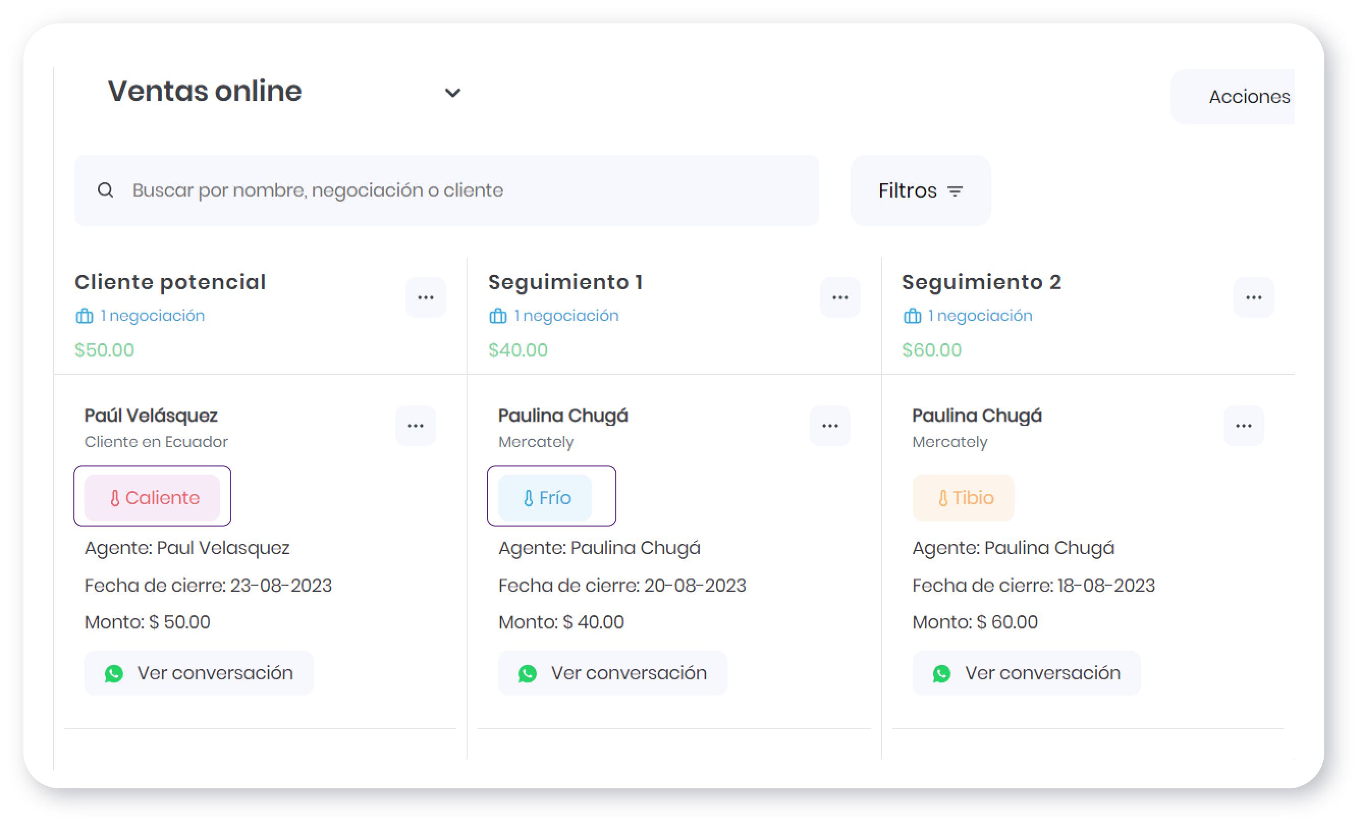 Usa las etiquetas predeterminadas de FRÍO, TIBIO o CALIENTE para llevar unseguimiento más detallado y personalizado. Esto te permitirá saber exactamente en cual estado se encuentran tus negociaciones y cuánto esfuerzo necesitas para cerrarlas.